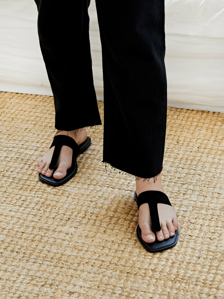The Rhodes Sandal by A.Emery in collaboration with Matteau are a truly minimal sandal. With a chunky t-strap silhouette, these black suede sandals sit atop a lightly padded footbed and are made from full grain leather with leather upper, insole and outsole.