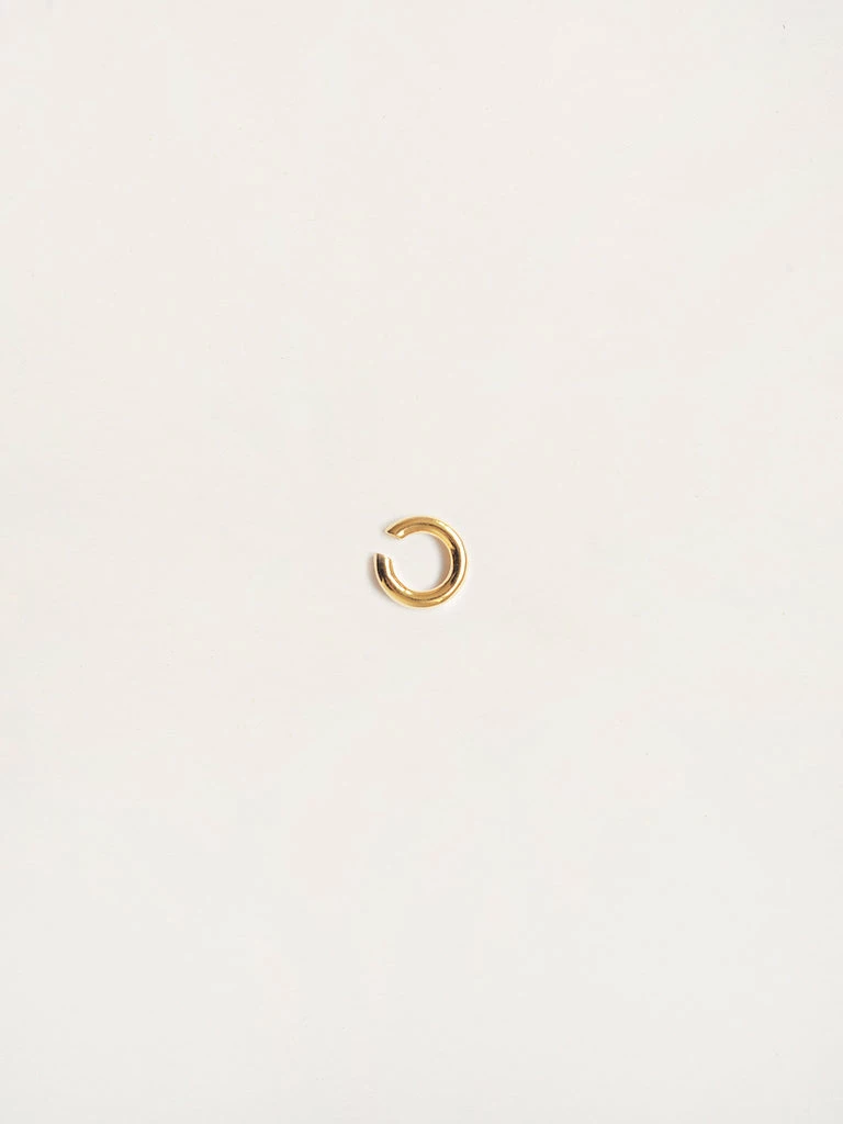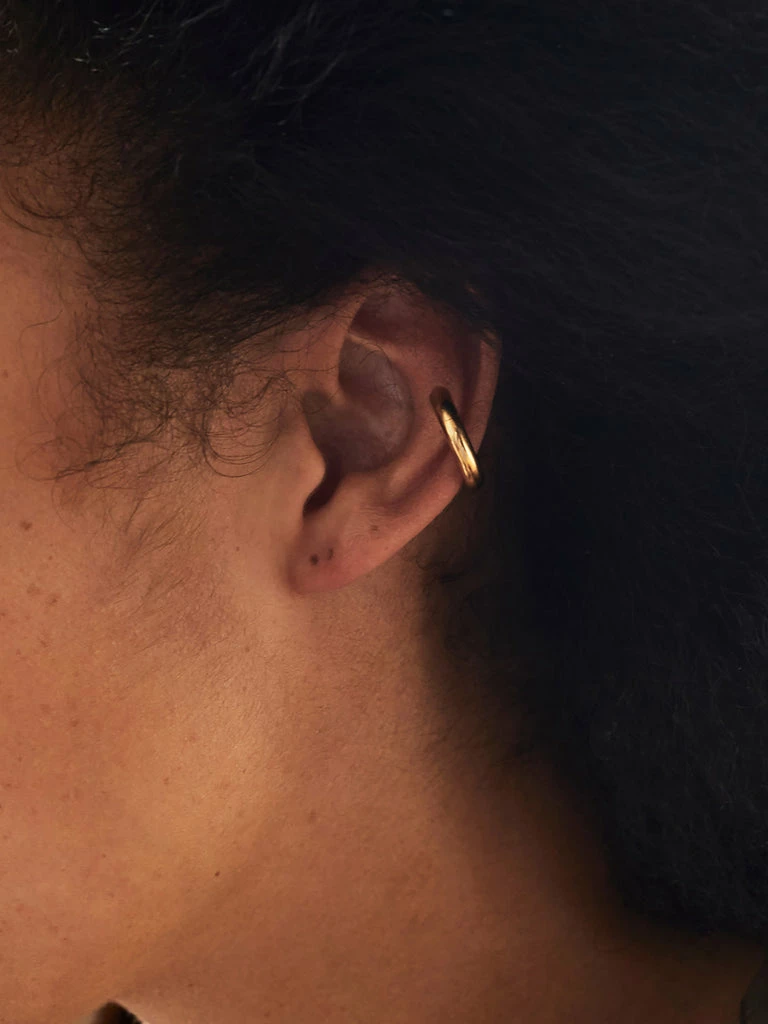 The Almost Earcuff by Swedish brand All Blues is a classic and minimal no piercing ear cuff with the All Blues logo in the cross-section and easily slides on the ear, handmade in Stockholm from polished 18ct gold plated 925 sterling silver.