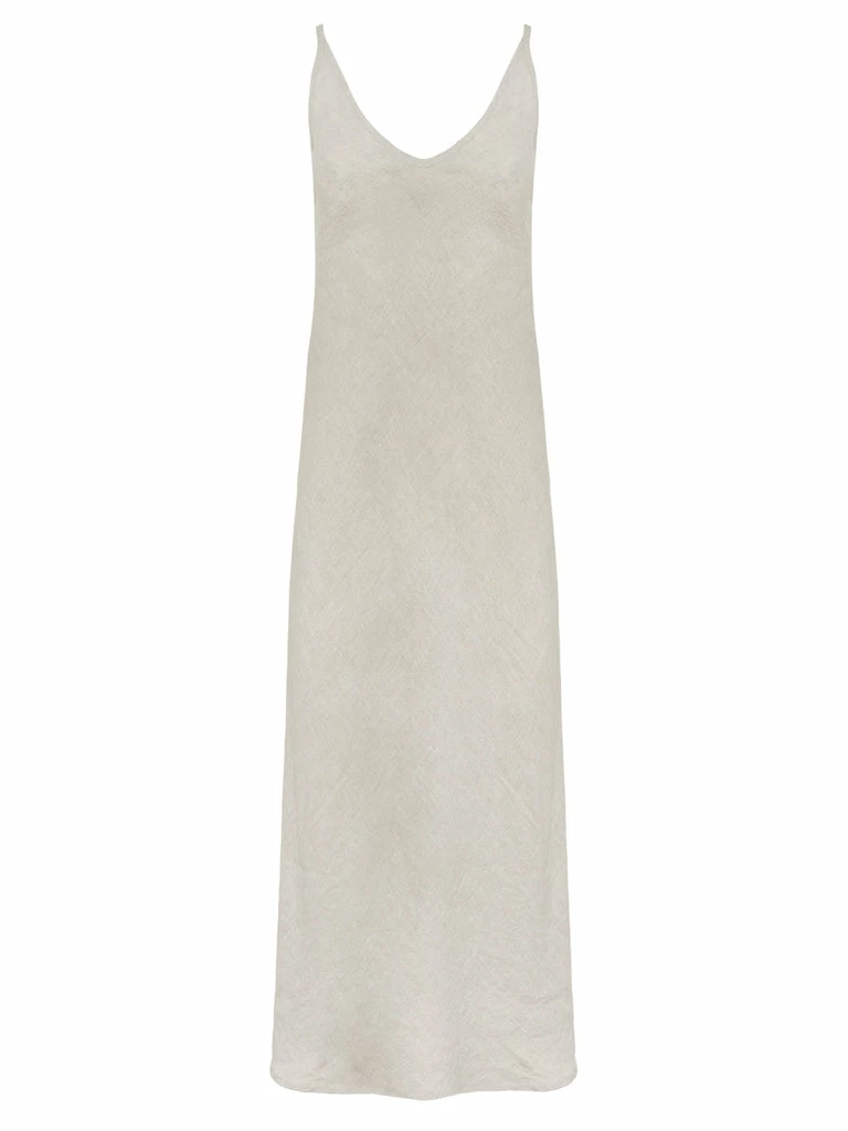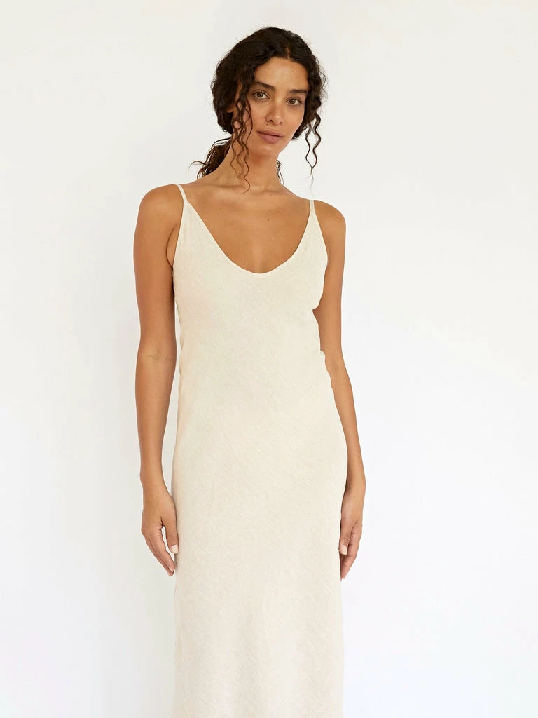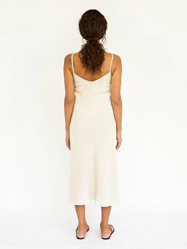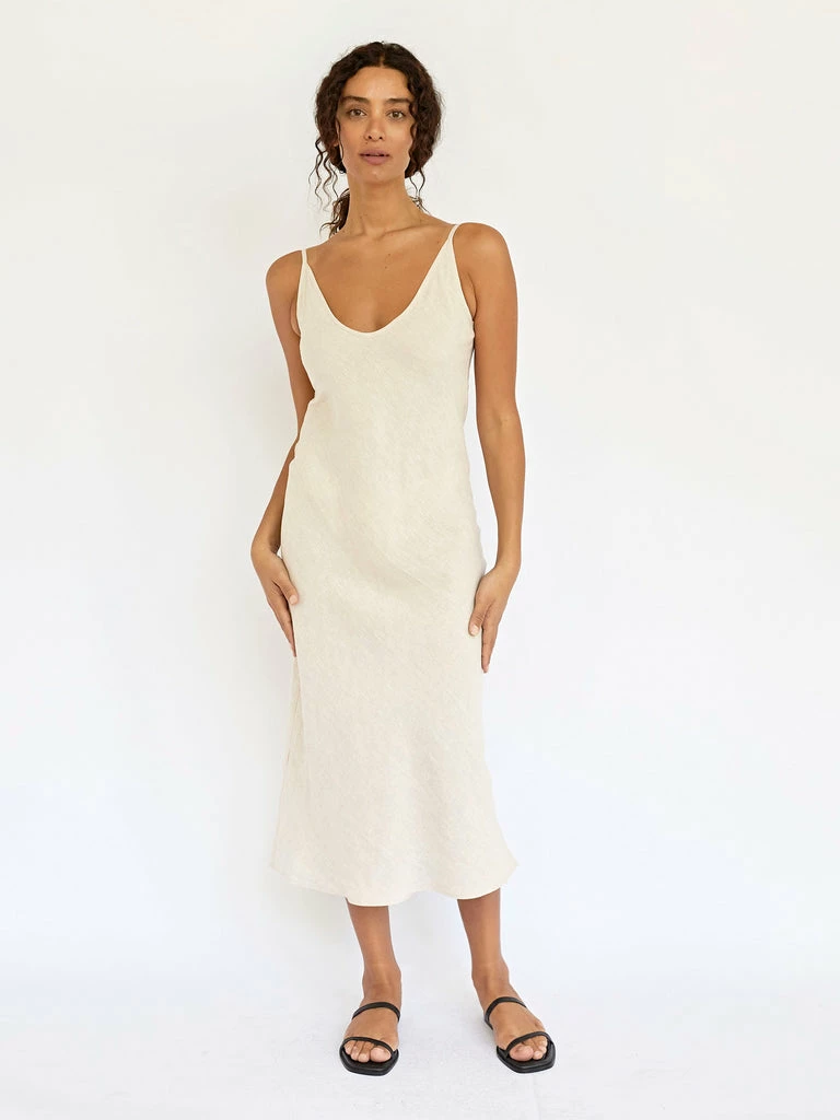 The Midi Bias Dress by Australian designer Dominique Healy is a simple bias slip dress that flows into a slight a-line skirt. Made from 100% Linen.